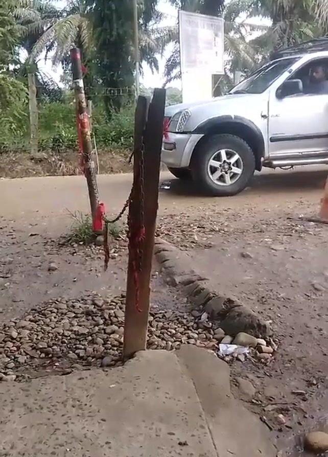 dirt road with a silver pickup truck parked next to an orange traffic cone. A man wearing red pants and no shirt is standing next to the truck. The road appears to be on the edge of a forest with palm trees visible in the background. There is a wooden post on the side of the road that is decorated with red material. The ground is covered in gravel and dirt.
