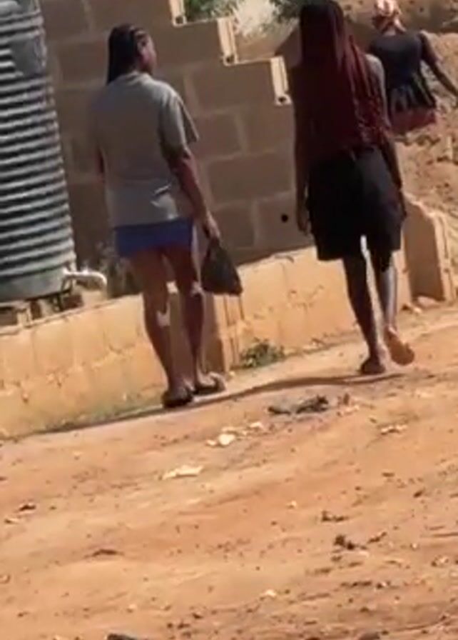 A low-angle shot shows three women walking away from the camera. Two women walk on a dirt road, while a third woman walks up a dirt hill. The first woman is wearing a gray shirt and a short blue skirt. She carries a small black bag in her left hand. The second woman has long, red hair and wears a dark red top and a black skirt. The third woman is wearing a dark top and a patterned scarf on her head. Behind the women are a water tank, a partially-constructed brick wall, a hill of dirt, and a two-story building.
