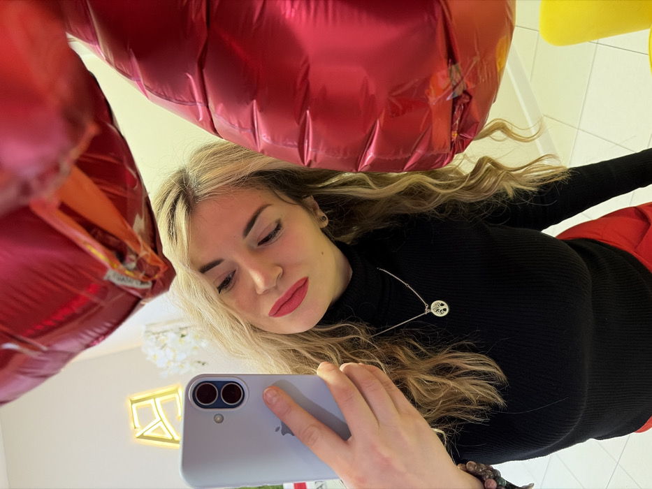 A female subject with long blonde wavy hair is depicted taking a selfie. She wears a black ribbed turtleneck top, a red lower garment, red lipstick, and a silver-toned necklace featuring a circular "Tree of Life" pendant. Her left hand holds a light gray iPhone, with its dual camera lenses visible on the back. Her gaze is directed downwards and to the right. The indoor environment, located in the city of Budva, Montenegro, features light-colored walls. A golden neon-like light fixture, appearing as the letter "A", is affixed to the upper left wall, adjacent to white floral decorations. A yellow object, resembling a chair back, and white tiled flooring are visible in the lower right background. Two large, inflated red foil balloons occupy the upper portion of the frame; one displays a tag on its underside.