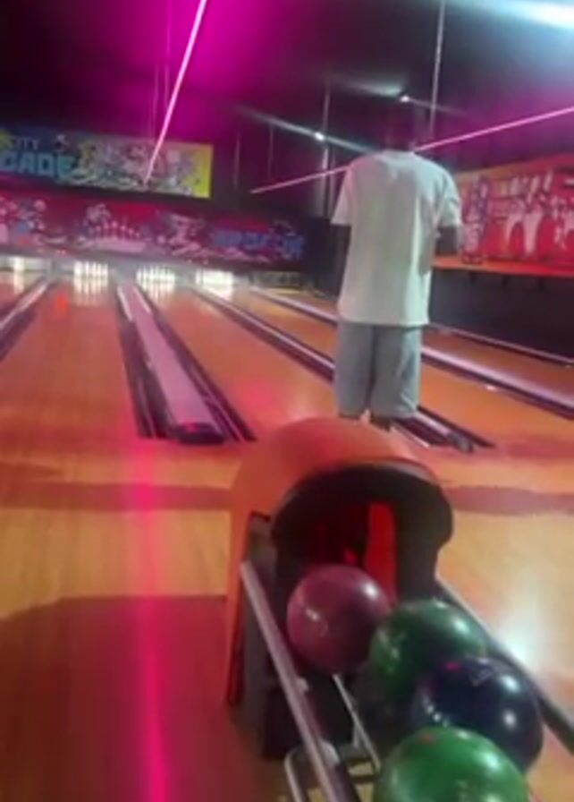 bowling alley, with a bowling ball return rack in the foreground that is holding bowling balls of various colors. A person in a white t-shirt and shorts is standing down the lane, and another person in a white t-shirt and dark pants approaches the bowling lane in the background. The lighting in the bowling alley is pink. The lanes are marked with arrows and there are bowling pins set up at the end. A scoreboard is visible in the upper portion of the video.