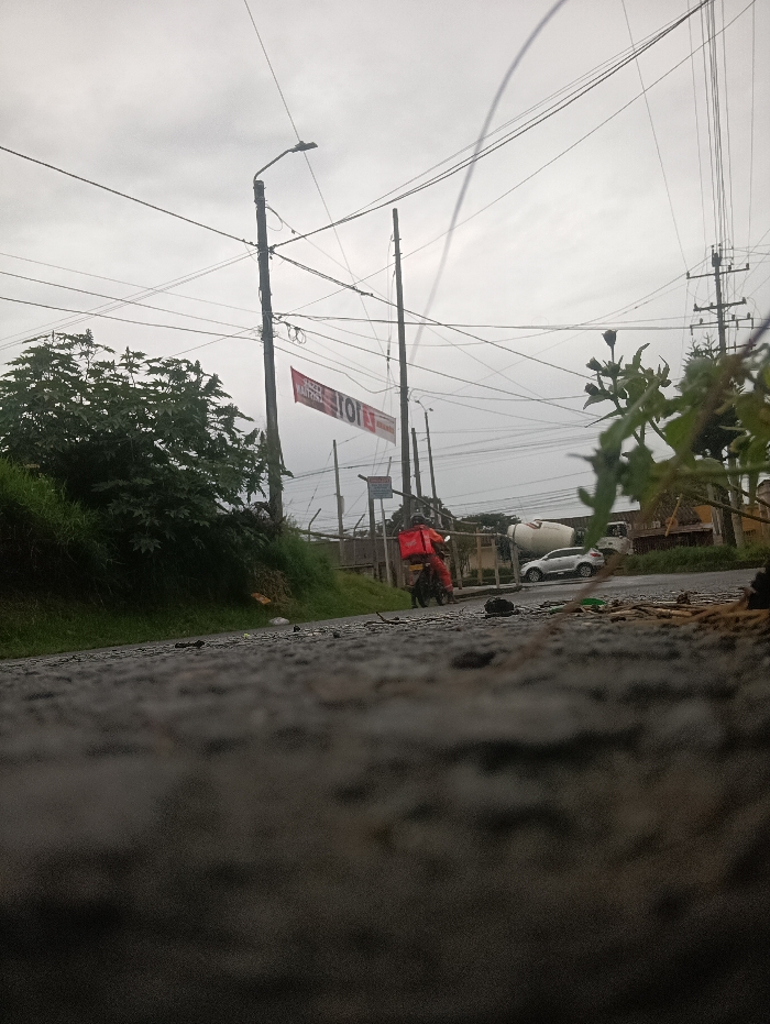 A low-angle shot shows a textured asphalt road leading toward a street scene. In the distance, a red-clad delivery person on a motorcycle drives past a white car and a cement mixer truck. Above, power lines crisscross a cloudy sky. A "TOTAL" banner hangs between poles. A bush is on the left, while plants are on the right.