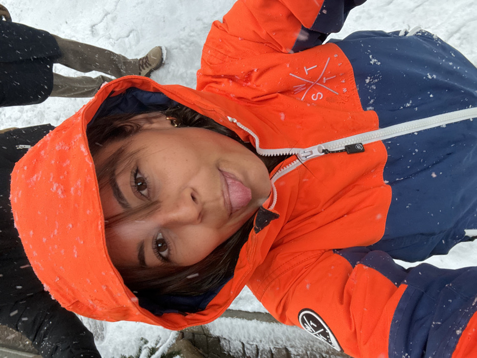 An outdoor scene in Limone Piemonte, Italy, captures a female individual positioned centrally in a close-up, slightly high-angle shot during snowfall