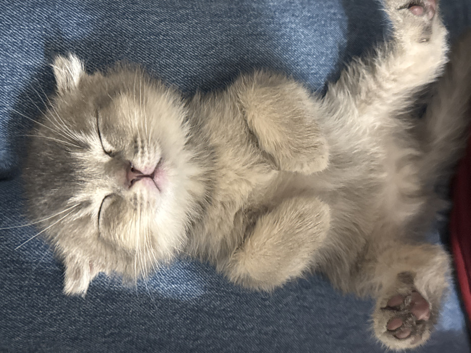 The scene is located in Strasbourg, France. A small kitten, exhibiting light grey and tan fur, is depicted sleeping on its back. The kitten's eyes are closed, its small pink nose is visible, and its front paws are curled near its chest while the hind paws extend upwards, revealing pinkish-brown paw pads. The animal rests on a blue denim fabric, likely clothing, with a dark red fabric visible in the upper background. Whiskers are present on the kitten's face.