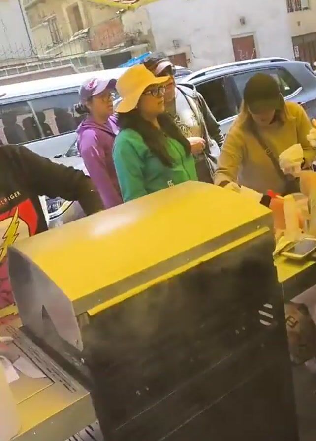 street fair or market. Several people are standing around food vendors under yellow tents. One vendor is grilling food on a black grill with a yellow lid. Another vendor is serving drinks from a table with various containers and cups. A woman sits nearby, waiting, while another woman walks by with a dog on a leash. Parked cars and motorcycles can be seen in the background.