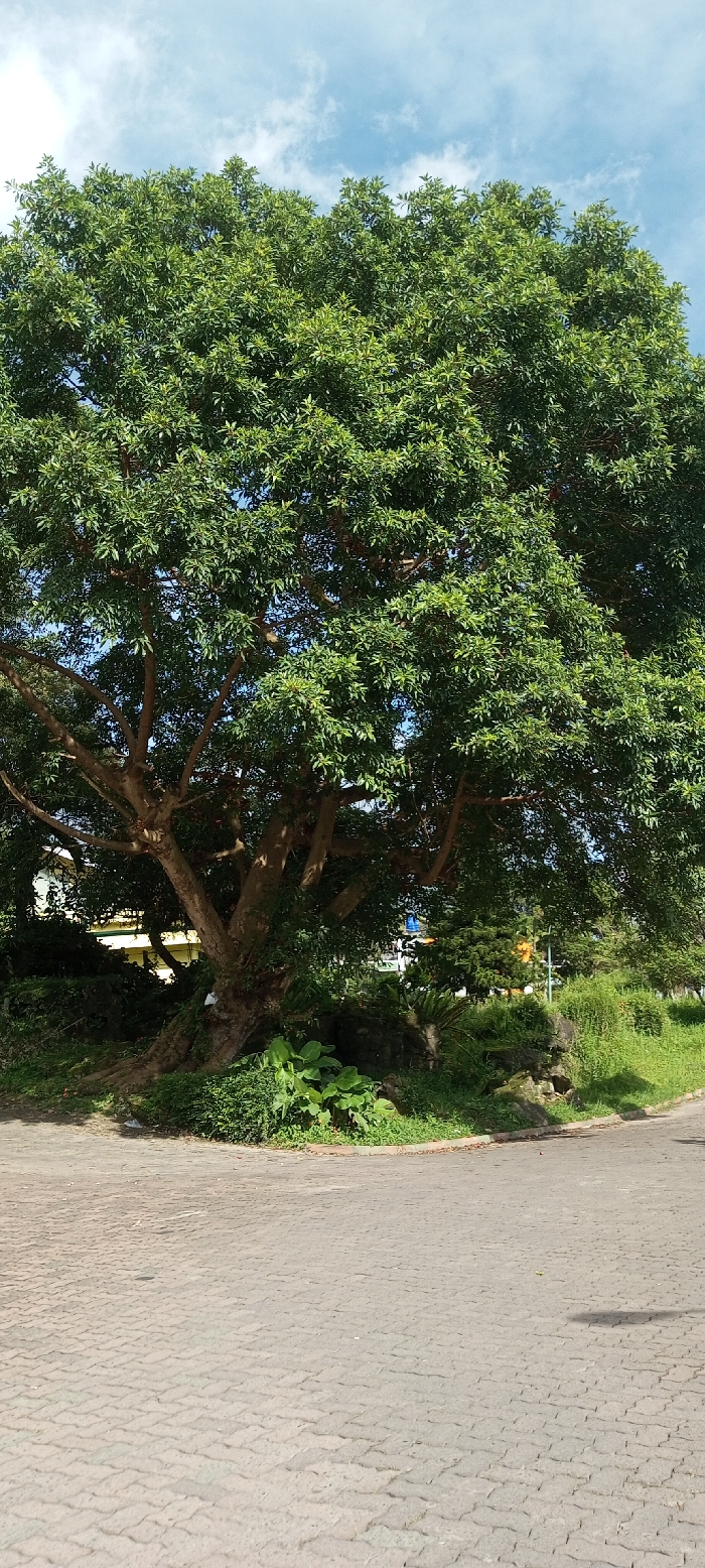 A large, mature tree dominates the image, its dense green leaves forming a rounded crown against a sky with scattered clouds. The tree's thick trunk and branches extend over a paved area. At the base of the tree, a small patch of green plants grows. The paved surface leads away from the tree, suggesting a road or path. The overall scene conveys a sense of natural beauty blended with a built environment.