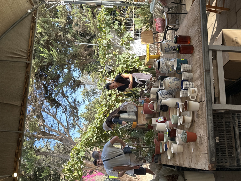 This image depicts an outdoor market stall in Kfar Vitkin, Israel, under a translucent canopy, presenting a variety of pottery, plants, and related goods