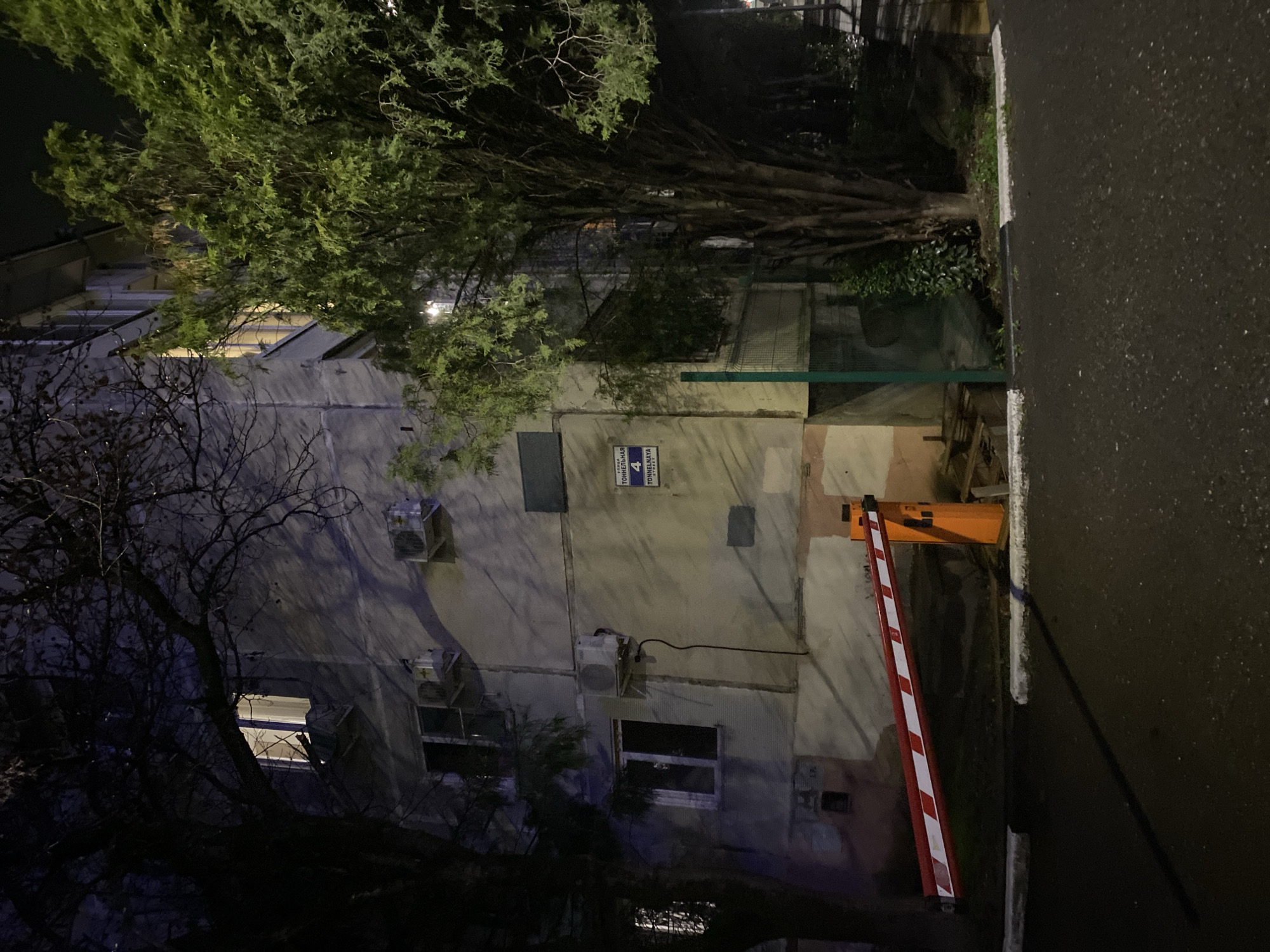 corner of a building in Sochi, Russia at night. The building is gray and appears to be an apartment complex. There are several windows, some with lights on inside, and air conditioning units mounted on the exterior. A street sign for "TONNELNAYA 4" is visible on the building. An orange and white striped security barrier is positioned next to the building, likely controlling access to a parking area or road. A tree with dense foliage is partially obstructing the view of the building. The street is wet, suggesting recent rain.