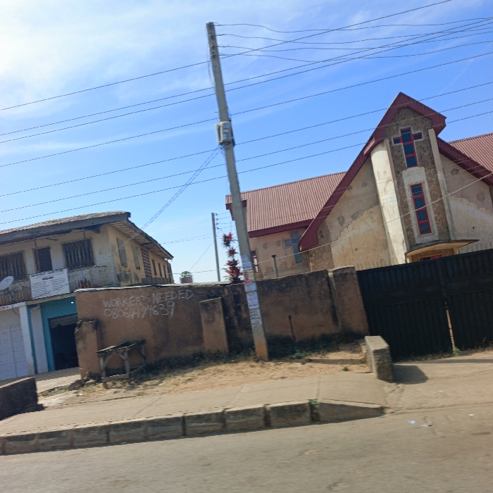 The image captures a street scene in Bukuru, Nigeria, under a clear blue sky with sparse clouds. In the immediate foreground, a grey concrete sidewalk and curb delineate a paved road. A weathered concrete wall spans the midground, separating the street from the properties behind it. White spray-painted text on this wall reads "WORKERS NEEDED 08064971639". A small, rudimentary wooden table or bench is positioned against the wall below the text. To the left, a two-story building with a light-colored, weathered facade and a reddish-brown roof is visible. Its upper floor includes a balcony with a white railing and multiple windows fitted with dark grilles or shutters. The ground floor displays a blue-painted storefront. A prominent, tall grey utility pole stands centrally, supporting multiple power lines that extend across the sky. A grey utility box is affixed to this pole. To the right of the utility pole, a church-like building is visible with a distinctive red-tiled gable roof and a lighter, aged facade. Its front elevation features a central vertical architectural element incorporating a red cross and several red-framed vertical windows. A dark metal gate, partially visible on the far right, appears to be an entrance to the church property. Red decorative plants are visible behind the wall near the church, possibly around a smaller utility post. No individuals are present in the scene.