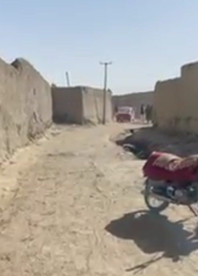 A narrow dirt road runs between tall, weathered mud walls, leading toward a distant red car and a small group of people. A motorcycle with a red and brown patterned cover sits parked on the right side of the road. A power pole stands near the center of the frame. A thin, shallow stream of water runs along the road. The sky is clear and bright. The overall setting appears to be a rural or underdeveloped area.