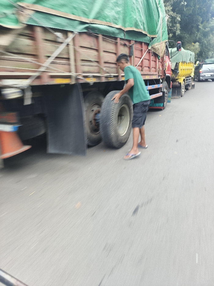 - "A man in a green shirt and dark shorts stands beside a large truck, holding a tire" by FM-x3nfq1, licensed under CC BY 4.0
