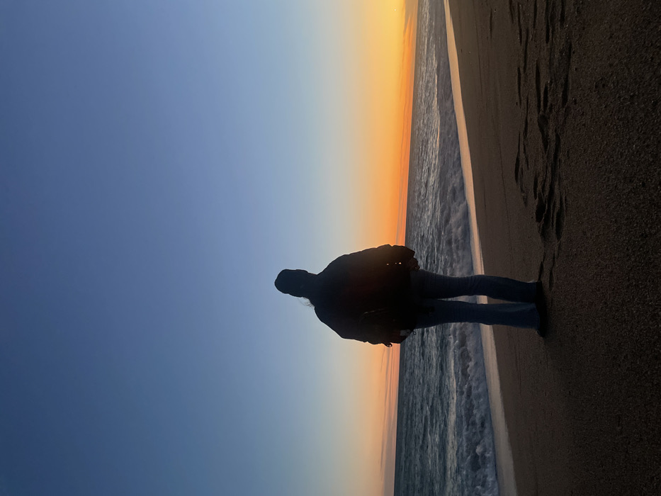 A silhouette of a person stands on a beach at sunset. The sky transitions from blue to orange. Waves gently touch the shore. The sand is dark, marked with footprints. The person, facing the horizon, wears a jacket and jeans. The shot is taken from a low angle and is rotated 90 degrees clockwise.