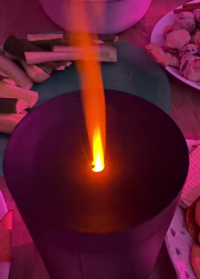 A close-up shot focuses on a cylindrical black candle with a prominent, bright orange flame emanating from its center. The candle is surrounded by plates of snacks, including sliced cucumbers, fruit salad in a white bowl, and other assorted appetizers. The scene is illuminated with a red-purple hue, likely from ambient lighting. There is background music.
