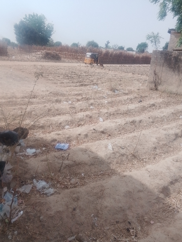 The scene depicts an open, dry, and dusty area in Kanwa, Nigeria. The foreground features light-brown, tilled earth with distinct parallel furrows. Numerous pieces of discarded plastic, predominantly white and blue bags or wrappers, are scattered across the ground. On the far left, a dark mound of debris, possibly organic waste, is visible, also mixed with plastic litter. To the right, a weathered concrete structure, resembling a partial wall or foundation, stands, with a small green sapling growing adjacent to it. In the midground, a yellow three-wheeled auto-rickshaw is stationary. A dark-skinned individual is positioned beside the vehicle, facing towards the left side of the frame. A dark-furred animal, consistent with a dog, is on the ground near the individual and the vehicle. Behind them, a fence constructed from vertical wooden poles or dried stalks stretches horizontally across the field. Beyond the fence line, a dense band of dry, brown vegetation is present. The background shows several trees with green foliage under a hazy, light-colored sky, indicating either atmospheric dust or an overcast condition.