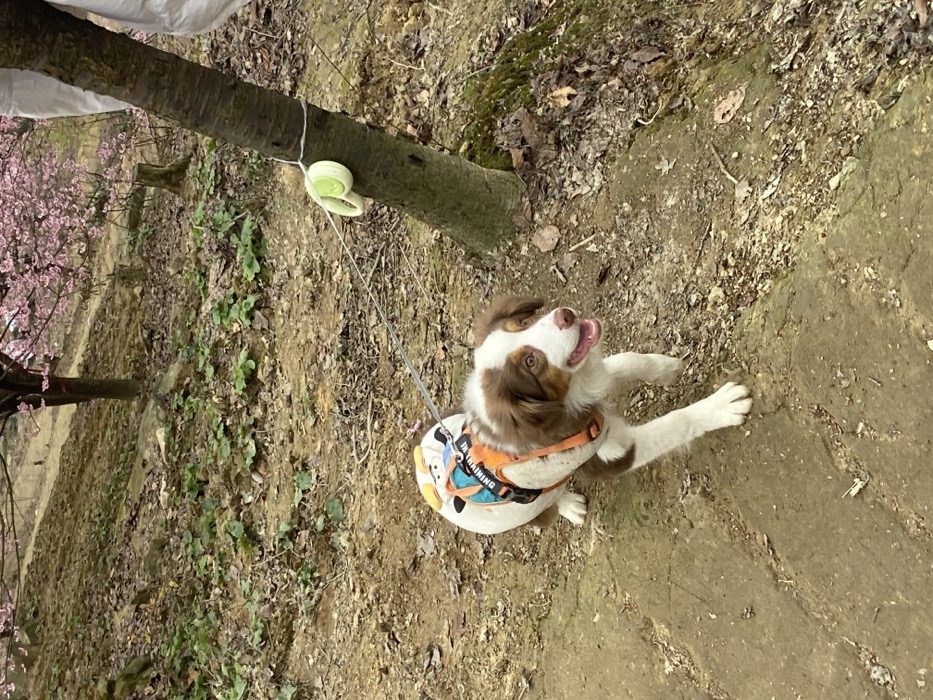 A brown and white puppy sits on a dirt path, looking up with its tongue slightly out. The puppy wears a harness labeled "IN TRAINING". A retractable leash is attached to the harness and extends to a tree on the left. The leash is secured to the tree with a white rope. The ground is covered with dirt, leaves, and patches of moss. Cherry blossom trees bloom in the background.