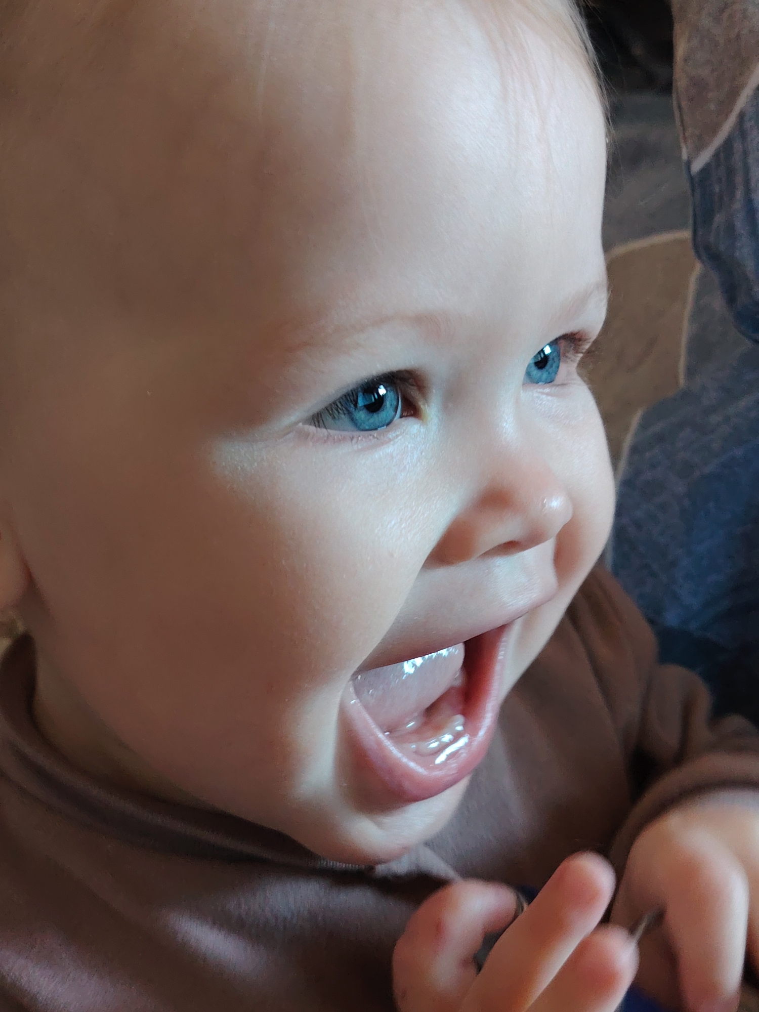 - "A close-up shot of a baby with bright blue eyes, light skin, and light hair, is shown smiling widely with mouth open, revealing some teeth and tongue" by FM-ieIBp1, licensed under CC BY 4.0
