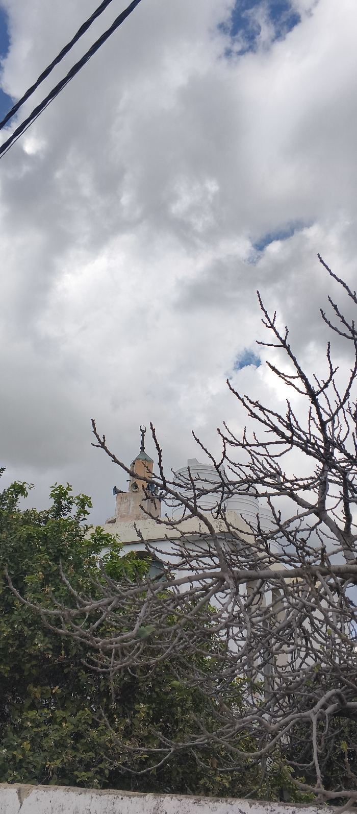 The image depicts an exterior view of a mosque structure partially obscured by vegetation under an overcast sky in Unknown, Unknown. Two dark utility wires are visible diagonally in the upper left quadrant, silhouetted against a cloudy sky with interspersed patches of blue. In the midground and foreground, a dense network of bare, dark brown tree branches occupies the right and central portions, while lush green foliage is present on the lower left. A low, weathered white wall runs along the bottom edge of the frame. The mosque features a slender, light-colored minaret on the left, topped with a crescent moon and star finial. Multiple blue loudspeakers are mounted on the minaret. To the right of the minaret, two white cylindrical structures, identified as water tanks or domes, are visible on the building's rooftop. No individuals or specific actions are depicted.