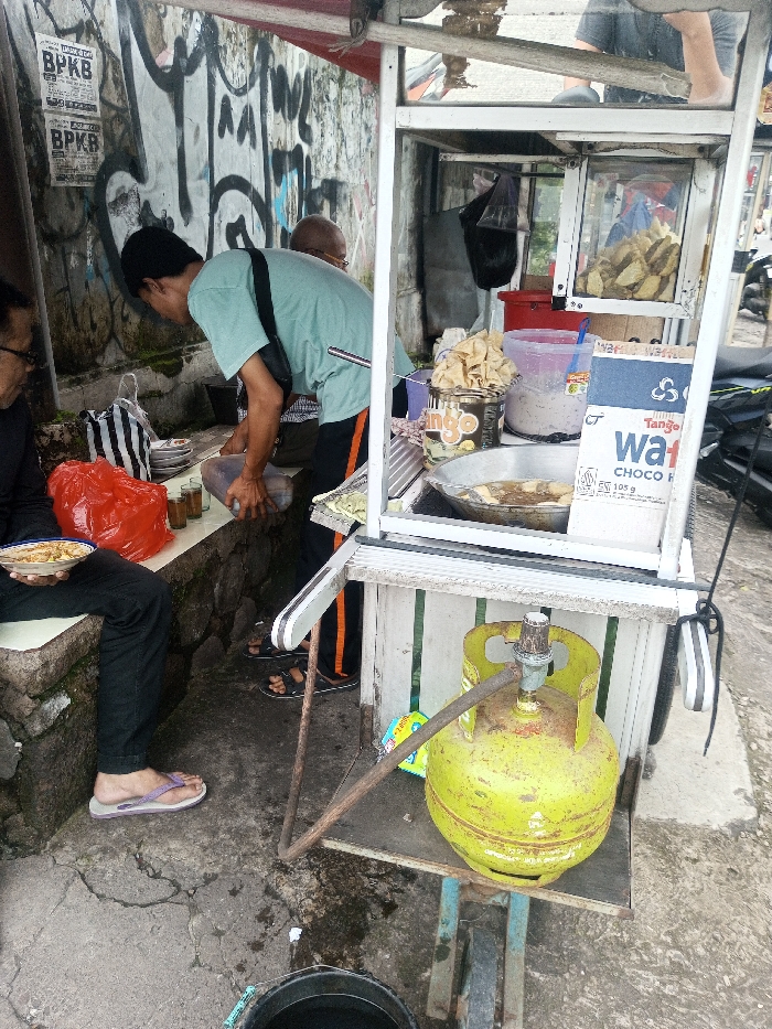 The scene depicts a street food stall in the city of Sandamal Eliya, Sri Lanka. A white metal food cart with multiple shelves is positioned on the right side of the frame. On its middle shelf, a large metal wok containing oil and food items is actively deep-frying. Adjacent to the wok are a plastic tub with light-colored contents, a "Tango Mango" branded tin, and a "Tango Waffle Choco FIE" cardboard box. A glass display case on the top shelf holds several fried food items. A bright green LPG gas cylinder with a regulator and hose is secured on the bottom shelf of the cart. To the left of the cart, a person wearing a light blue t-shirt and dark pants with an orange stripe is bent over a low stone ledge, pouring a dark liquid from a clear plastic bottle into multiple small glasses. This individual wears dark sandals. To their left, partially seated on the stone ledge, another person wearing dark clothing and purple flip-flops holds a white bowl of food. A third individual, bald, is partially visible in the background behind the person in the light blue shirt. The stone ledge serves as a seating area and a counter, holding a red plastic bag and a black-and-white striped bag. The background features a light-colored wall heavily covered with black graffiti and several stapled papers, one prominently displaying "BPKB." The ground is uneven concrete, and a black bucket is visible in the lower-left foreground.