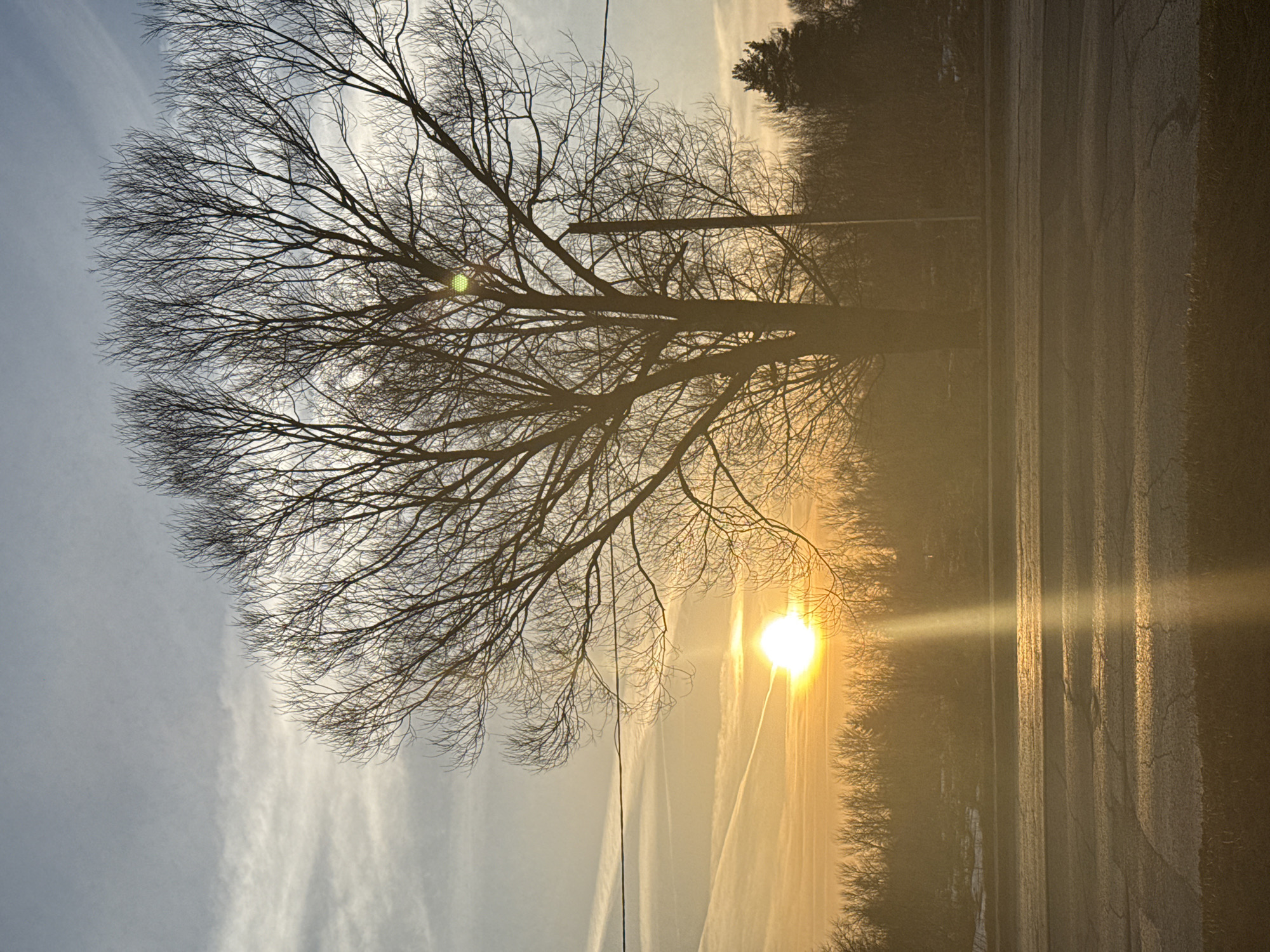 tree with bare branches silhouetted against a bright, hazy sunrise or sunset