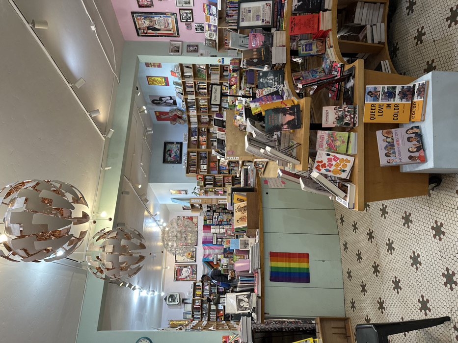 An interior shot reveals a vibrant bookstore with walls lined with shelves stacked with books. Two large, modern globe-shaped light fixtures hang from the ceiling. Near the back, a rainbow flag and a transgender flag adorn the wall. Books are prominently displayed on tables and shelves throughout the store. The floor features a patterned tile design.