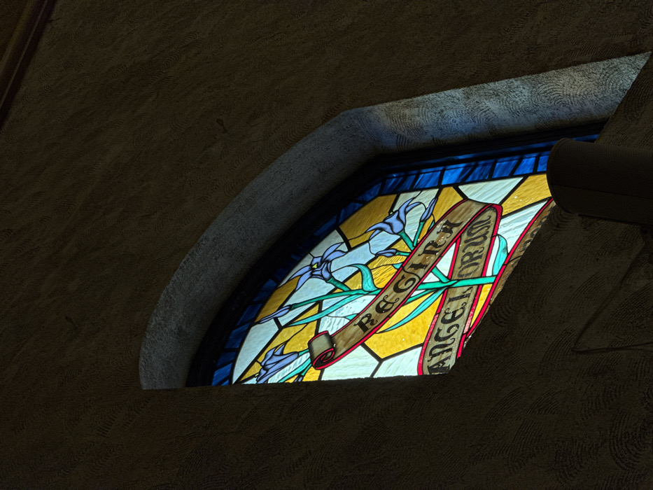 The image presents an interior view of an arched stained-glass window embedded within a textured, dark beige wall
