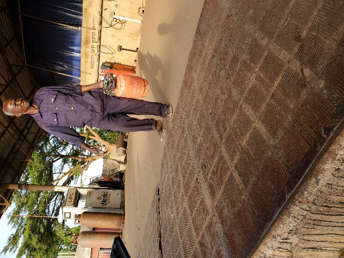 The image depicts an outdoor LPG (Liquefied Petroleum Gas) refilling station in Jos, Nigeria, under daylight conditions. An elderly male, with grey hair and a slight beard, is the central figure, walking from right to left across the concrete ground. He wears a dark blue work uniform, consisting of trousers and a long-sleeved button-up shirt. In his right hand, he carries an orange-red gas cylinder by its top ring, with the word "SUPPLIER" partially visible. In the foreground, a large, rectangular, dark metal grate with a textured, studded grid pattern covers a section of the ground, bordered by a rough concrete edge. To the man's left, in the background, are several tall, rusty metal cylinders, likely for gas storage. Adjacent to these is a white LPG dispensing unit marked "LPG" and "Nevis Gas Ltd." Green foliage from trees is visible beyond these structures. To the man's right, a light-colored wall features two prominent white text warnings: "NO SMOKING" and "SWITCH OFF YOUR PHONE," with blue sheeting or tarpaulin above. Various metal objects, including what appears to be another gas cylinder and weighing scales, are present near this wall. The entire immediate area is covered by an industrial-style corrugated metal roof supported by visible poles. Shadows are cast to the left of objects, indicating sunlight from the right.