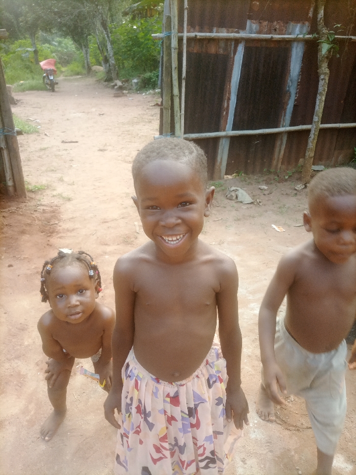 Three bare-chested children stand on a dirt path. A girl on the left wears beads in her hair and looks at the camera. A boy in the center smiles broadly, wearing a patterned skirt. Another boy on the right walks past, wearing light-colored pants. Behind them, a rudimentary structure of metal and wood stands next to a dirt road with a motorcycle parked further down. Trees and greenery line the road in the distance.