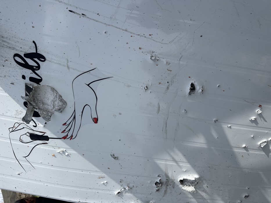 - "A white corrugated metal or panel surface, located in Dura, Palestinian Territory, is extensively damaged with numerous impact points" by FM-RIphO2, licensed under CC BY 4.0