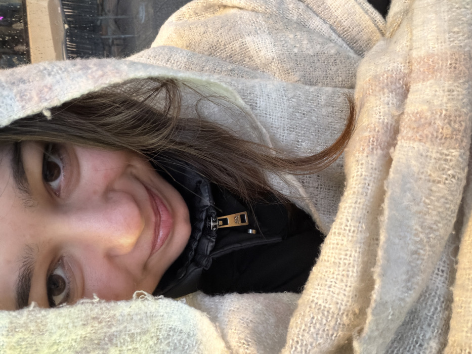 A person wrapped in a creamy white woven shawl with light peach-toned stripes peeks out, smiling at the camera. They wear a black puffer jacket, visible at the neck. Brown hair with blonde highlights is seen, with one curled strand escaping the shawl. The person has brown eyes and fair skin. The background hints at an outdoor scene.