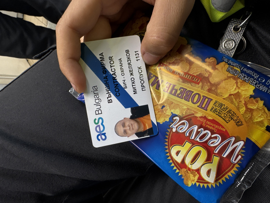 A close-up, first-person perspective image depicts a right hand holding an identification badge and a packet of popcorn. The scene is located within or in the immediate vicinity of the AES Galabovo Thermal Power Plant, near the city of Obruchishte, Bulgaria, as indicated by the "aes Bulgaria" logo on the badge. The primary subject is a white identification badge with the "aes Bulgaria" logo at the top left. The badge displays "ВЪНШНА ФИРМА" (External Company), "CONTRACTOR," and "БИЧ - ОХРАНА" (Security/Guard). A headshot of a male, identified as "МИТКО ЖЕЛЯЗКОВ" (Mitko Zhelyazkov), is present on the left side of the badge. He has a shaved head and is wearing an orange shirt under a dark jacket. The badge number "ПРОПУСК 1131" (Pass 1131) is printed at the bottom right. Beneath the badge, partially obscured by the hand, is a blue and yellow packet of "POP Weaver" brand microwave popcorn. Bulgarian text on the packet reads "Пуканки за микровълнова фурна" (Popcorn for microwave oven) and "ЕСТЕСТВЕНИ И ИЗКУСТВЕНИ АРОМАТИ" (Natural and Artificial Flavors), along with "ПОВЕЧЕ" (More) and "отличен вкус" (excellent taste). The items are held above black fabric, likely pants or a uniform. In the lower right corner, a neon green/yellow strap with a silver keyring is visible. The background is indistinct, showing additional black fabric and a light-colored floor, suggesting an indoor setting.