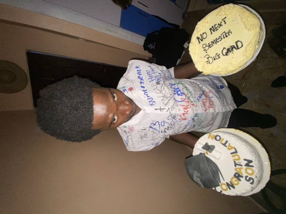 An individual is depicted indoors in Sabon Tasha, Nigeria. The dark-skinned person, with a prominent afro hairstyle, looks directly into the camera with a focused expression. He wears a white collared shirt adorned with numerous handwritten signatures and messages in various colors. A silver cross pendant hangs around his neck. He holds two round cakes: one white, decorated with a graduation cap, a diploma, and "CONGRATULATION SON" in gold and black lettering; the other yellow, inscribed with "NO NEXT SEMESTER BIG GRAD" in black icing and scattered sprinkles. The background features light brown walls, a dark door, and a circular wall decoration. A dark object rests on the floor to the right.