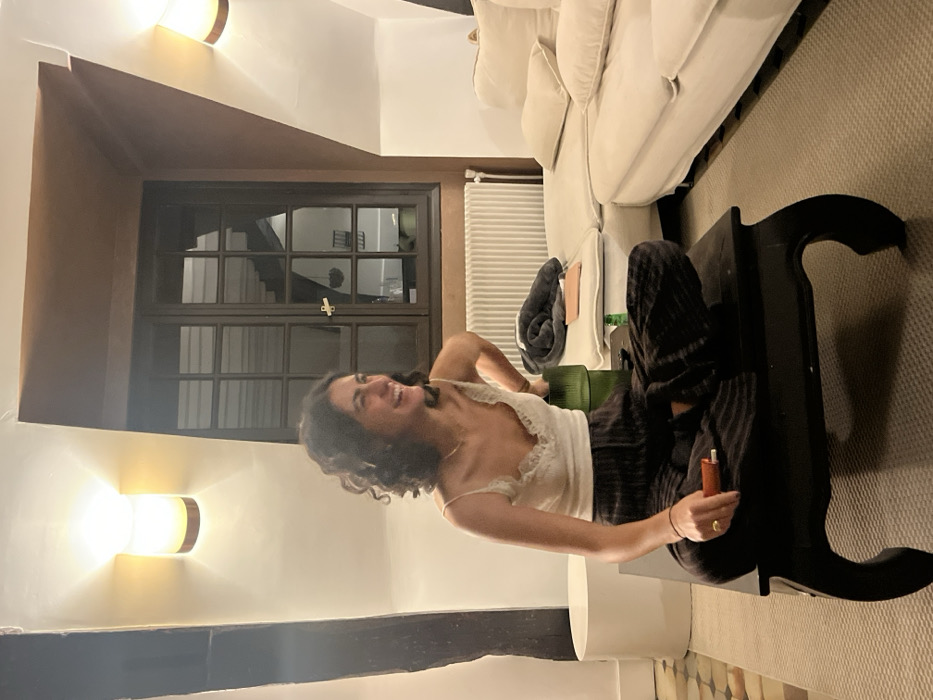 - "An indoor photograph depicts a female individual seated cross-legged on a dark, ornate coffee table within what appears to be an attic apartment in Paris, France" by FM-Gy0vP2, licensed under CC BY 4.0