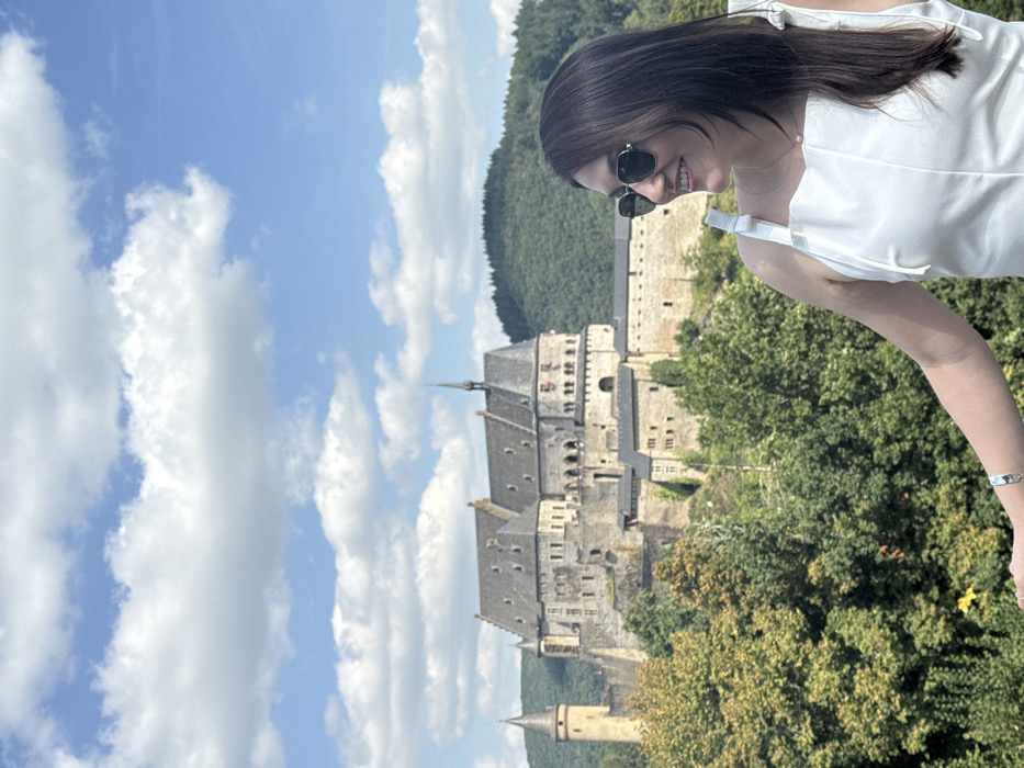 The image depicts a female subject in the foreground, positioned to the right of the frame, smiling and looking towards the right with her head slightly tilted. She wears dark sunglasses, a white sleeveless top with bow accents on the shoulders, a delicate necklace with a pearl pendant, and a silver-colored bracelet on her left wrist. Her dark hair is loose, extending past her shoulders. In the mid-ground and background, the Vianden Castle is prominently featured on a hilltop. The castle consists of multiple stone buildings with various rooflines and turrets, including a prominent central structure with steep gray roofs and a slender spire, and a distinct circular tower to the left. The castle is surrounded by dense green foliage and trees, indicating a forested landscape. Beyond the castle and trees, rolling hills covered in dark green forest extend into the distance. The sky above is clear blue with numerous scattered white cumulus clouds. The scene suggests an outdoor, daytime setting with bright sunlight.