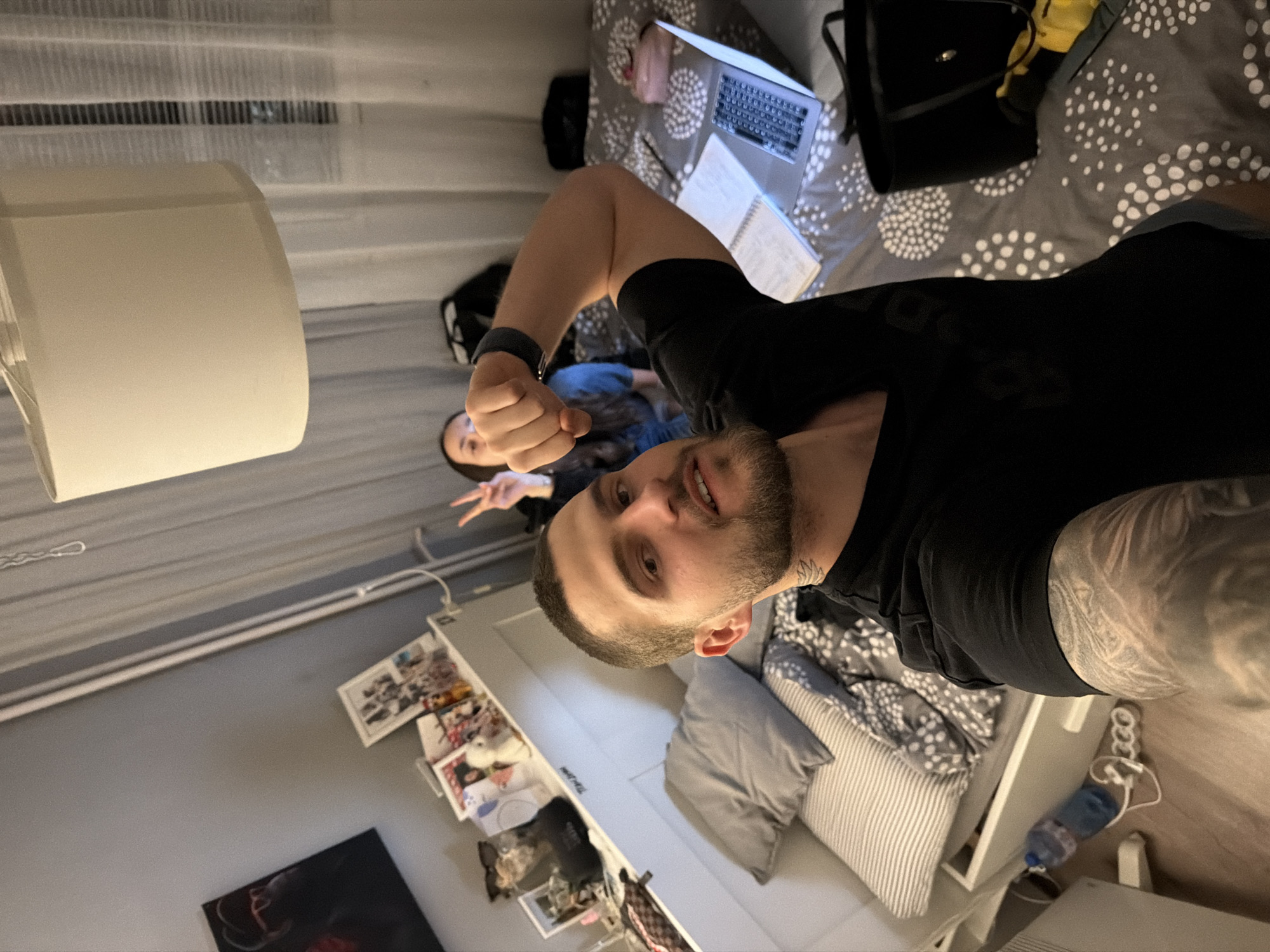 A selfie, most likely taken inside an apartment in Sofia, Bulgaria, shows a man in the foreground flexing his right arm towards the camera, wearing a black t-shirt and a smartwatch