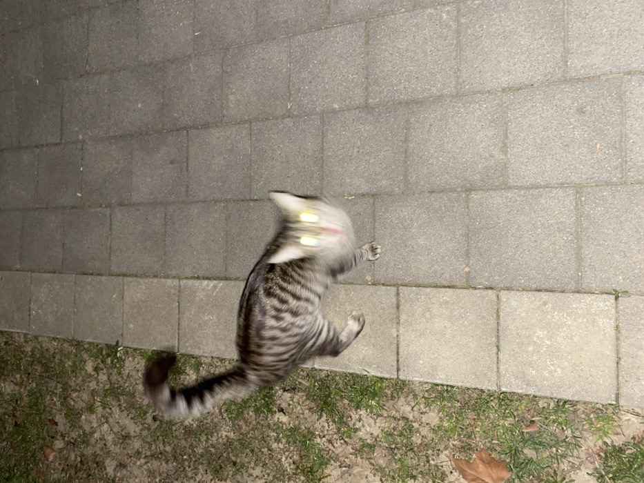 A tabby domestic cat is observed on a paved sidewalk next to a grassy area at night in Gabrovo, Bulgaria. The cat, exhibiting a grey and black striped coat pattern, is positioned in the lower left quadrant of the frame, facing towards the camera. Its eyes reflect a bright, yellowish-green light, indicative of flash photography. The cat's body and tail are visibly blurred due to motion, suggesting movement or a slight camera shake. Its tail is raised and curled. To the left of the sidewalk, a patch of sparse grass and dirt is visible, containing a single, brown, fallen leaf in the lower left corner. The sidewalk consists of rectangular grey paver stones.