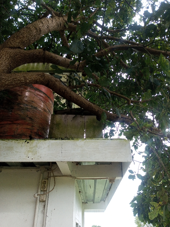 The image presents an upward-angled view of a building structure partially obscured by dense tree foliage in Abbireddygudem, India. A white building wall occupies the lower left quadrant, displaying an external electrical conduit system with a double electrical outlet and associated exposed wiring. Above the wall, a horizontal white-painted wooden beam, approximately 15-20 cm thick, extends across the frame, exhibiting areas of greenish discoloration and surface deterioration. The underside of an overhang, constructed from white panels, is visible beneath this beam. Resting atop the white beam, a weathered wooden plank or panel, approximately 30-40 cm high, shows significant greenish and dark discoloration. To the left of this panel, a large, reddish-brown cylindrical object, resembling a planter or barrel with visible horizontal striations, is partially visible. Several thick, gnarled tree branches with mottled, textured bark originate from the left, extending diagonally upwards and to the right, traversing over the cylindrical object and the wooden panel. The branches support dense green leaves and lighter twigs, filling the upper half of the image and partially obscuring an overcast sky. No individuals, animals, or discernible actions are observed.