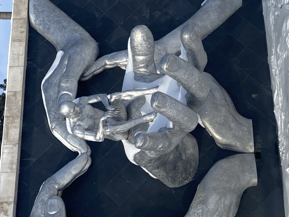 A large-scale metallic sculpture is depicted outdoors in a snow-covered environment within Galitsky Park, Krasnodar, Russia. The central subject is a silver-toned, hairless, male figure rendered with anatomical detail, seated in a contemplative or despondent posture, with his head bowed and hands resting on his knees. This figure rests directly on the upturned palms of a colossal silver hand. This central hand, along with several other disembodied silver hands, emerges from and is affixed to a dark, diamond-patterned wall. Patches of white snow accumulate on the surfaces of the metallic hands and the ground below the sculpture. Above the dark wall, a lighter concrete structure is visible, topped by a narrow band of blue sky and sparse, snow-dusted tree branches.