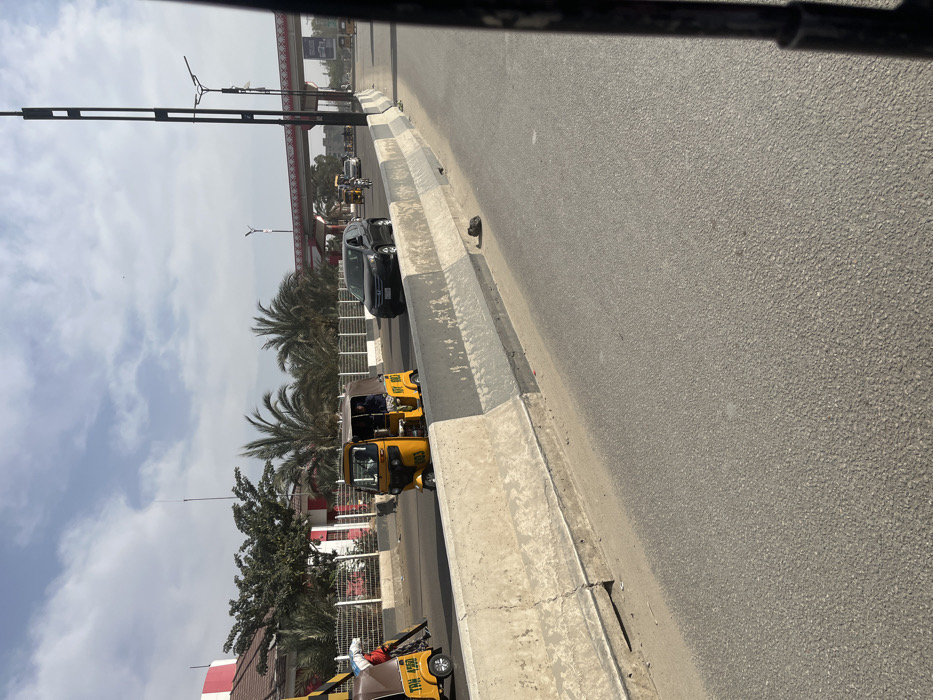 The image presents a daytime street scene in Gandu Albasa, Nigeria, under a sky with scattered white clouds. The perspective is from within a vehicle, with a black vertical frame component visible on the far right. In the foreground, a multi-lane asphalt road is present. A series of grey concrete Jersey barriers line the left edge of the visible roadway. A small, dark, unidentifiable object rests on the asphalt adjacent to the base of these barriers. Traffic is observed on the road. On the left side of the thoroughfare, two yellow three-wheeled motorized rickshaws are prominent. The leftmost rickshaw, partially visible, bears the inscription "TRN 4902" and other text. A person, wearing a white top and dark trousers, is positioned at the rear of this rickshaw, appearing to adjust or load a large grey-white object secured with a red/orange rope, which extends diagonally upwards. A second individual is visible seated inside this vehicle. The adjacent yellow rickshaw, marked with "KRY-803," is in motion with an occupant visible as the driver. Further right, a dark-colored Honda CR-V is also in transit. The background features a red and white fence running parallel to the road, behind which are multiple green trees, including several palm trees. A building with red and white structural elements is partially discernible behind the trees on the far left. A substantial red and white pedestrian overpass, decorated with geometric patterns, spans the road further in the distance. Tall black streetlights, some equipped with multiple luminaires, are positioned along the roadside. Additional vehicles, including other yellow rickshaws and a motorcycle, are visible further down the road.