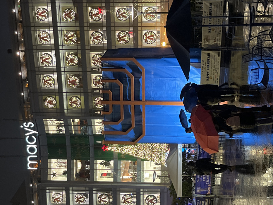 A building, likely Macy's, decorated with wreaths in the windows, is seen. A large menorah stands in front of it, partially covered in blue. A Christmas tree adorned with lights is also visible. People with umbrellas gather around the menorah and there are signs wishing "Happy Chanukah!" A banner identifies a Chabad SF event. It appears to be raining, as reflections are visible on the wet ground.