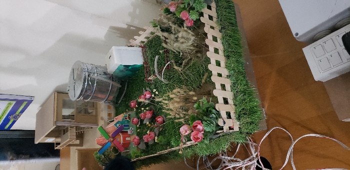 The scene depicts an indoor environment, specifically a room or display area in Kandahar, Afghanistan. In the foreground and center, a rectangular diorama is positioned on a wooden table. The diorama base is covered with artificial green grass. Within the diorama, miniature elements include a multi-colored windmill with red, purple, green, and blue sections, clustered artificial pink roses, patches of artificial dry grass stalks, green succulent-like decorations, and sections of white picket fencing made from craft sticks. Two curved white plastic or metal pieces are also present on the grass. Behind the diorama on the left, a light brown wooden model building with a balcony and external staircase is visible. To its right, a cylindrical silver object resembling a silo or water tower model stands. Adjacent to the silver cylinder, a small white rectangular box model with a greenish-blue component in front is situated. In the upper left background, a blue and green banner or poster with white text is affixed to a light-colored wall. White electrical wires are coiled on the wooden table surface to the left of the diorama. In the lower right corner, two white electrical housings or boxes are visible on the table, one featuring a diagram with four squares. A human hand, with a dark sleeve, is partially visible on the left side, positioned near the diorama.