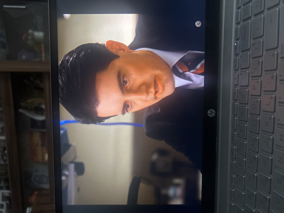 An open, silver-colored HP laptop is depicted from a slightly elevated, close-up perspective, resting on an indistinct surface indoors. The laptop screen displays a video featuring a Caucasian male with dark hair, dark eyebrows, and a light complexion, looking towards the lower right of the frame with his mouth slightly open, suggesting speech. He is dressed in a dark suit, a white collared shirt, and a red, white, and blue striped tie. A small, circular, metallic-colored lapel pin is affixed to his left lapel. The background within the video is blurred, showing an indoor setting with indistinct objects and a vertical blue cable. The "hp" logo is visible below the screen. The laptop's keyboard, featuring a QWERTY layout with additional Cyrillic characters specific to the Bulgarian alphabet (e.g., 'Ч' on the 'Y' key, 'Ш' on the 'P' key, 'Ж' on the 'Z' key), is prominent in the foreground. The physical environment behind the laptop is blurred, revealing a dark wooden shelf or cabinet holding several indistinct decorative objects. The Bulgarian Cyrillic keyboard indicates the image originates from a location in Sofia, Bulgaria.