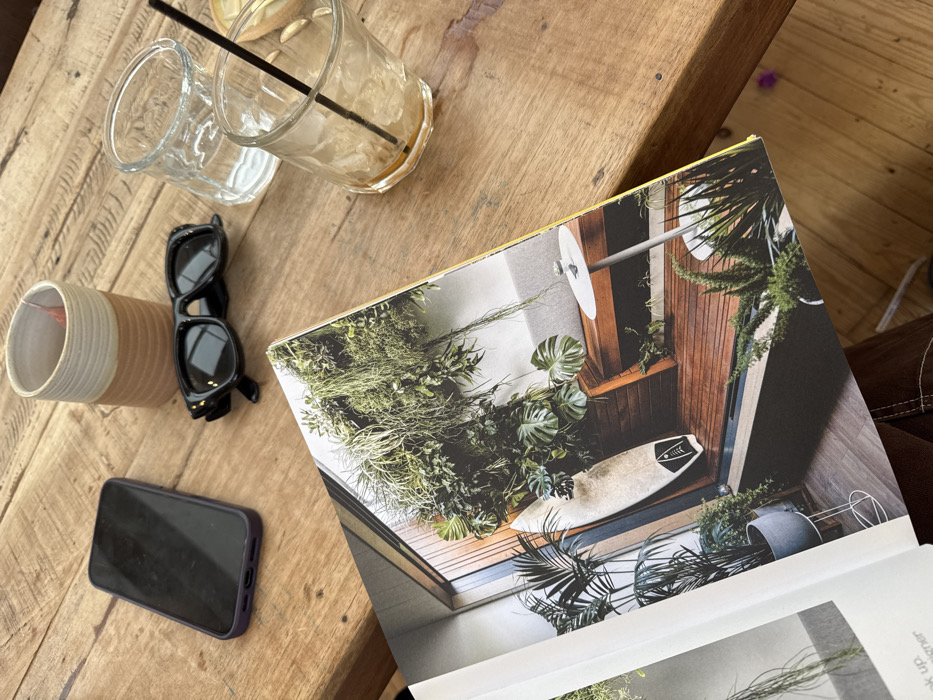 This image captures a close-up, downward-angled view of a rustic wooden table located in the Vouliagmeni Municipal Unit, Greece. On the left, a dark-cased smartphone rests face down. Adjacent to it are a two-toned ceramic cup (beige upper, brown lower) with a small red tag inside, and black sunglasses with dark lenses. To the right, two textured glasses are present: one appears empty, and the other contains residual amber liquid, melting ice, a black straw, and small garnishes. Dominating the lower left is an open magazine or book, displaying a vibrant image of a modern outdoor living space. This depicted scene features a vertical garden with various lush plants, including large Monstera leaves, a light-colored surfboard propped against a wall, wooden decking, a built-in wooden bench with a light grey cushion, and a round white side table. No people are visible within the frame.
