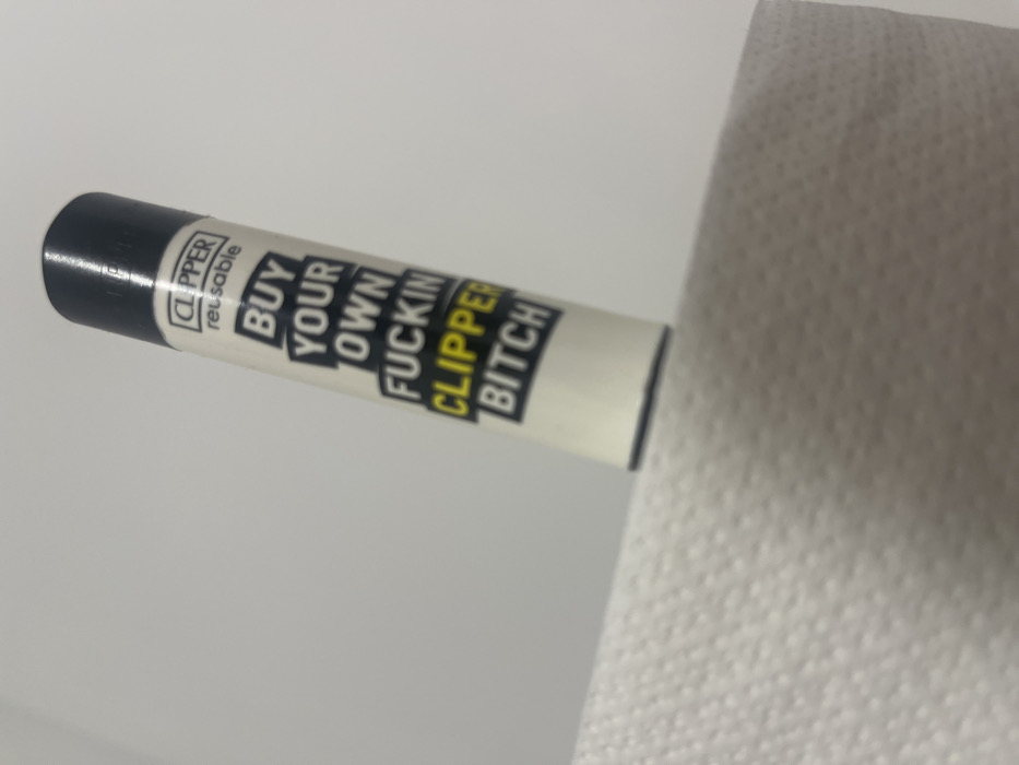 - "A white Clipper lighter with a black top rests on a roll of toilet paper" by FM-UzABM2, licensed under CC BY 4.0