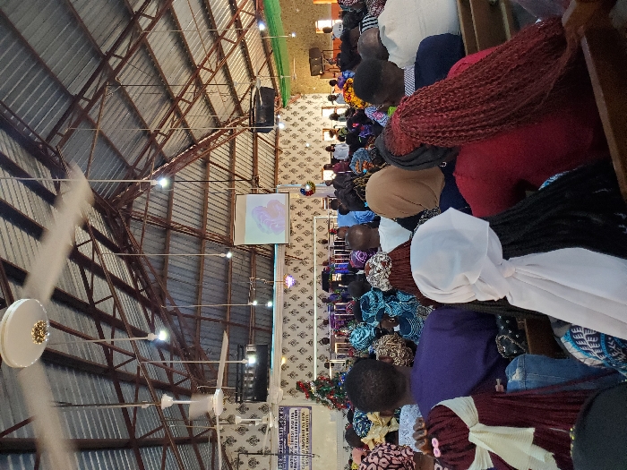 An indoor scene shows rows of people seated in what appears to be a church. The angled perspective looks toward the front of the room where a screen displays an image. The ceiling is constructed with a metal framework and corrugated metal panels, illuminated by rows of lights. Several ceiling fans hang overhead. The space is filled with people in various attire, their backs facing the camera, suggesting a service or gathering is in progress.