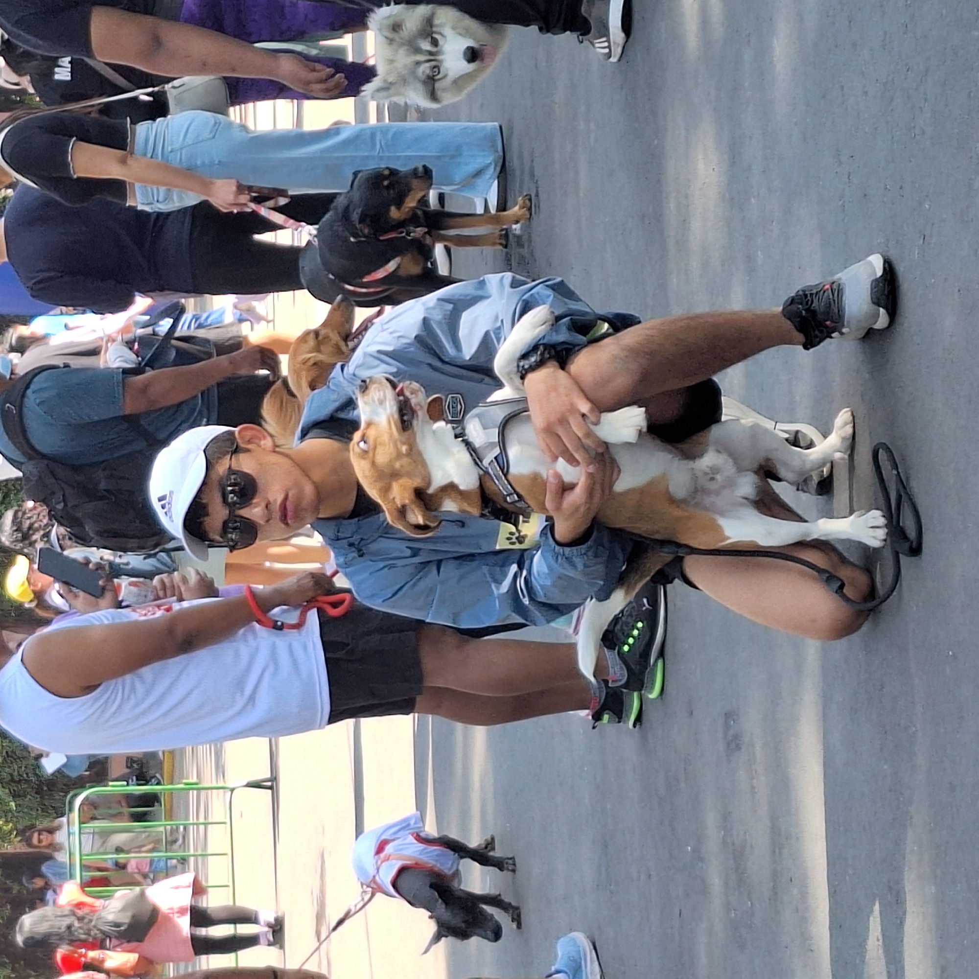 n outdoor gathering in what is likely Arequipa, Peru, given the urban environment and diverse group of people. The event appears to be centered around pets, specifically dogs, as several individuals are holding or accompanied by canines. A young man wearing a white baseball cap and sunglasses is kneeling and holding a tan and white dog, which appears to be wearing a harness. He is wearing a blue jacket and black shorts. Several other people and dogs are visible in the background, suggesting a pet-related event or gathering. The environment is a paved street or plaza. A metal fence is visible in the background. Several other people with dogs and associated objects are in the immediate vicinity.