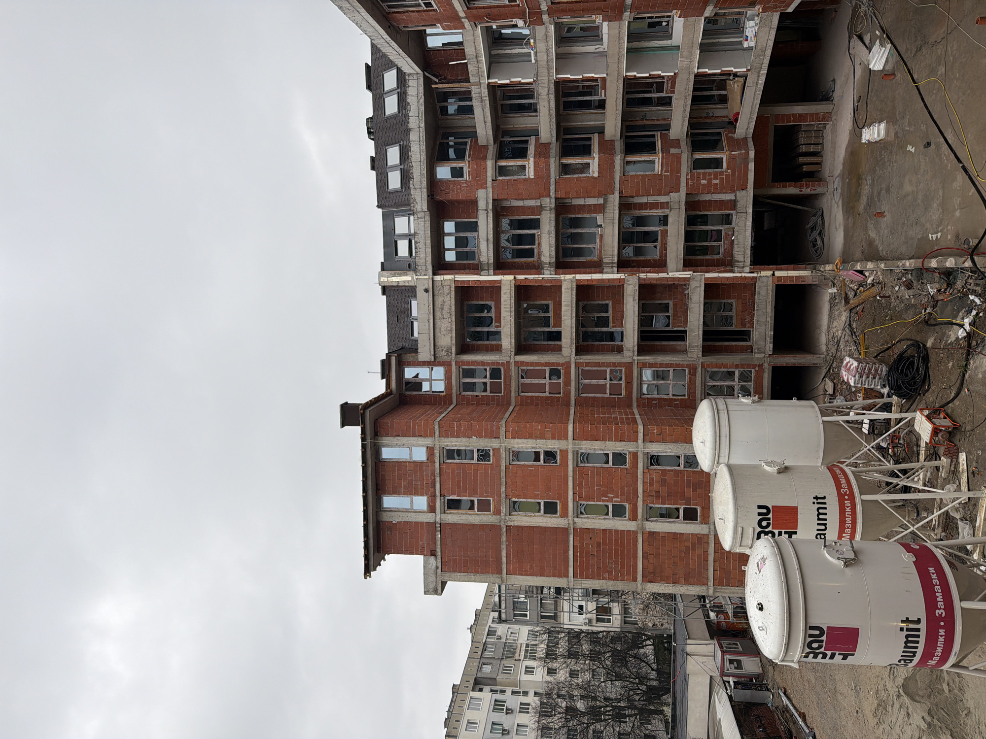 The image depicts a construction site in Sofia, Bulgaria, likely in an urban area. The focal point is an unfinished brick and concrete building, several stories tall with numerous window openings. Many windows have been installed. Concrete supports frame the brickwork. Beside the building are three large, cylindrical white containers labeled "BAUMIT", a brand of construction materials, implying their use in the ongoing building process. Wires, debris, and construction equipment litter the surrounding ground. In the background, residential apartment buildings can be seen, suggesting the new construction is located in a pre-existing neighborhood. The sky is overcast and gray, indicating a cloudy day. No people are visible in the frame.