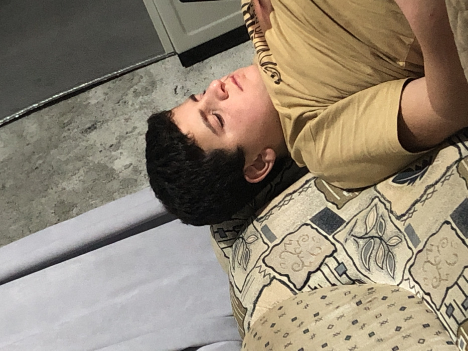 A young male with short, dark hair is depicted lying on his left side on a patterned sofa in an indoor setting in ქვედა სამება, Georgia