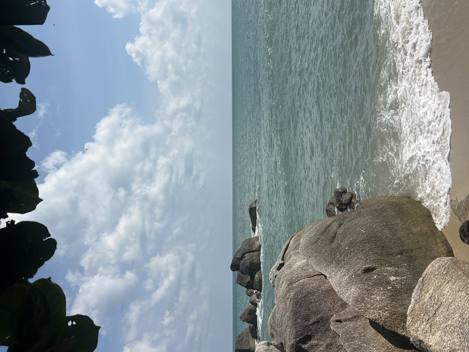 A vibrant landscape divides the frame. On one side, lush green foliage frames a bright, cloud-filled sky. The other half portrays the ocean, with clear water, rocky outcroppings, and foamy waves crashing onto a sandy beach. The stark contrast between land and sea creates a dynamic, visually appealing scene.
