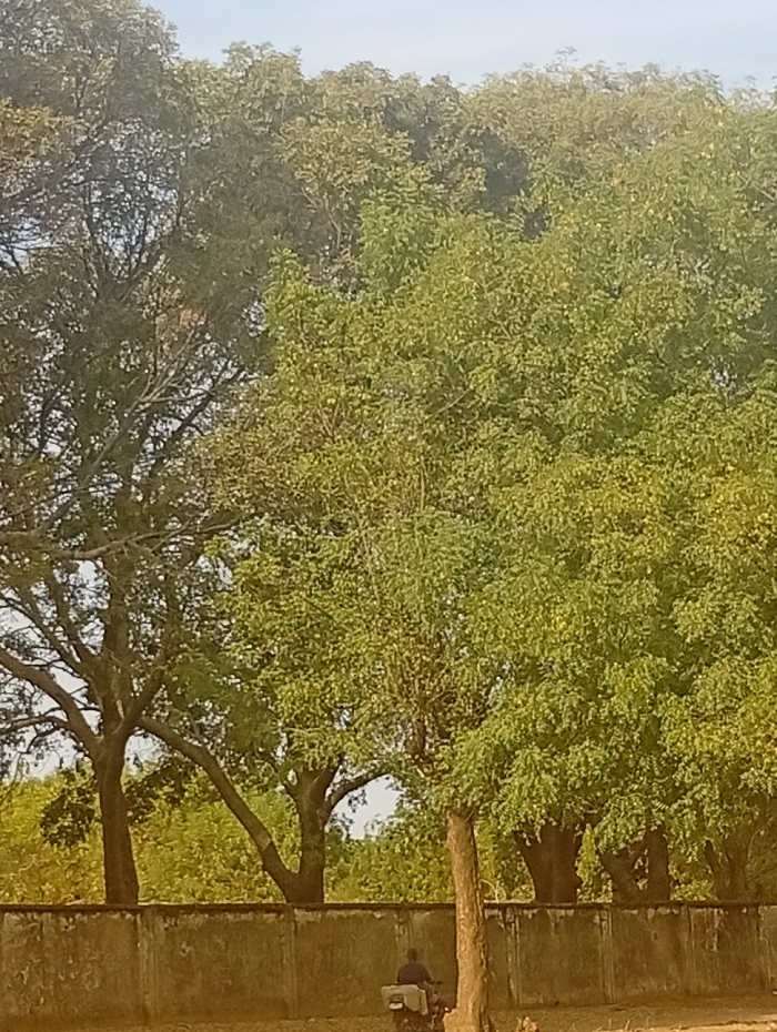 A person on a motorcycle is riding along a paved surface near a long wall. A line of trees with dense, green canopies rises behind the wall, filling much of the frame. A few taller, bare trees stand out on the left, their branches reaching upwards. The sky is partially visible at the very top.