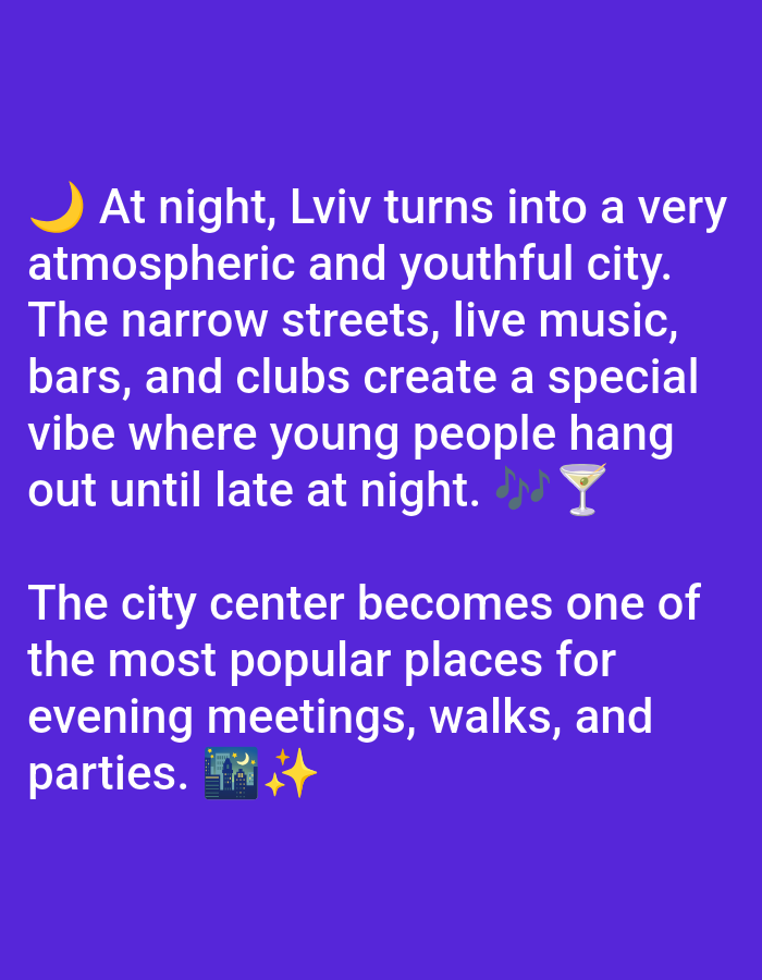 The image is a graphic displaying white text on a solid purple background, detailing aspects of nightlife in Lviv, Ukraine. The first paragraph, introduced by a yellow crescent moon emoji, describes Lviv as an atmospheric and youthful city at night, citing narrow streets, live music, bars, and clubs as venues where young people socialize until late. This paragraph concludes with green musical notes and a cocktail glass emoji. The second paragraph indicates that the city center is a popular location for evening meetings, walks, and parties, followed by a cityscape at night emoji and two yellow sparkle emojis. The text collectively describes the social environment and activities within Lviv's urban core during nighttime hours.
