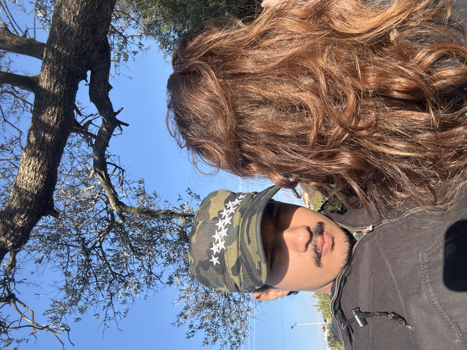 An outdoor, brightly lit daytime image, presumed to be taken in the Menashe Regional Council, Israel, depicts two individuals. On the left, a male with a mustache and medium-dark skin tone wears a camouflage cap with seven white stars on the front and a dark, zipped jacket; he looks directly forward. To his right, the back of a female's head is visible, characterized by voluminous, curly reddish-brown hair. The upper background features a large tree with thick branches and sparse foliage against a clear blue sky, while smaller trees, a light pole, and distant residential-like structures are visible in the left background.